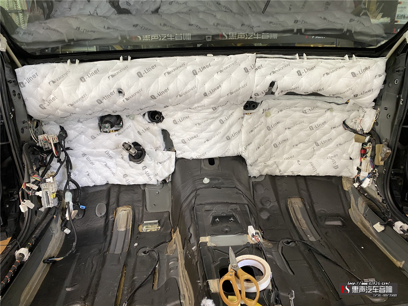 车尾箱使用Q-pad超级炸弹分块满贴进行减振处理。