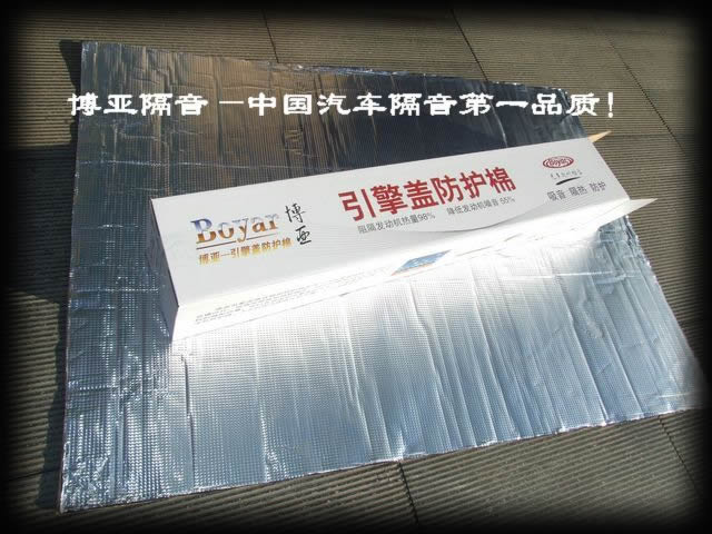 博亚引擎盖防护棉 主要采用的是闭孔发泡结构隔热隔声橡塑,可有效阻隔发动机热量及噪声。防护棉表面覆盖一层进口铝箔材料,能高效反射和消耗噪声、阻隔发动机的辐射热量、保护引擎盖漆面免受高温烘烤;同时具备优异的防火阻燃性能,即使遇到明火也绝对不会燃烧。与市面上同类产品相比有本质的优势。防护棉自带高性能自粘胶层,粘贴牢固不易脱落,严格确保产品使用寿命。 ☆ 更高防护性能:阻隔发动机热量98﹪ ☆ 更强隔声性能:降低发动机噪音最高可达55﹪ ☆ 更好安全性能:外覆铝箔护膜,杜绝了普通产品吸水、吸尘、易破损、易燃烧等现象 ☆ 更佳粘贴性能:高性能粘贴胶层,不会因高温烘烤而开胶和脱落 引擎盖防护棉一般施工到引擎盖的下表面。粘贴之前须先冲切或裁剪成形,棉的边缘要裁剪整齐,粘贴要美观大方,中间部位粘贴牢固没有气泡。施工时,引擎盖表面要擦洗干净,确保没有灰尘并保持干燥,然后将裁切好的引擎盖棉逐步粘贴并按压牢固。 注:引擎盖的隔声材料必须保证:阻燃耐高温、不吸水、不吸尘、便于清洁等特点,避免用性能较差的劣质材料施工。 Get Extra Cool&Quiet Comfort with BoyarPad!