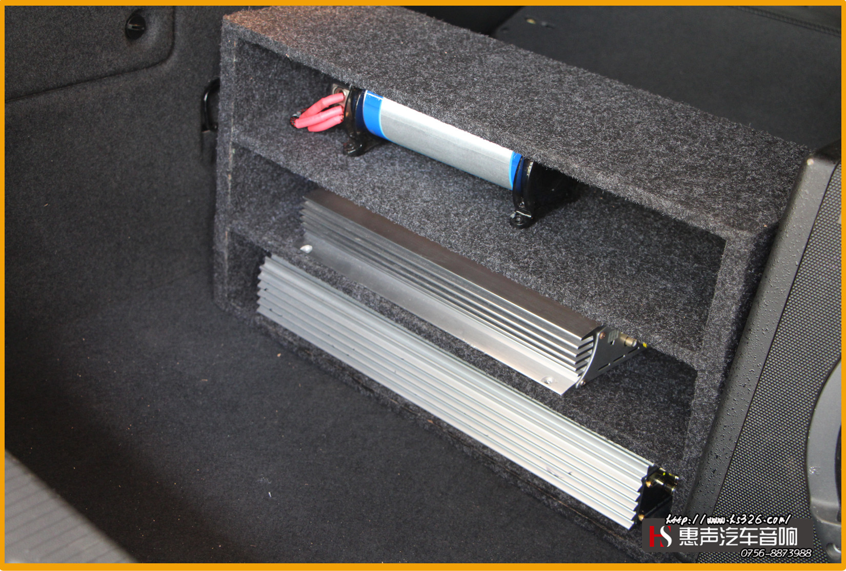 安装中道的四路功放推喇叭 卡莱的单路功放推低音炮 再加装卡莱1F电容 最后安装效果图