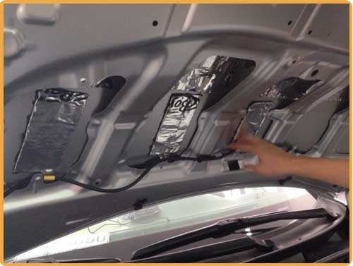 对引擎盖做上减震处理。看见上面像补丁一样的减震材料了吗?补丁一样的减震板黏贴在钢板上,使一整块钢板的各个部位的比重不同,使得各个部位的固有振动频率不同,从而降低共振。