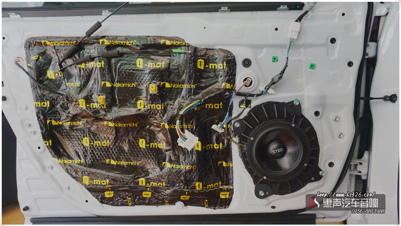 这次改装主要是以无损改装为前提,在提升音响的同时,降低由门板引起的噪音,这套音响的改装前声场采用史泰格ST650C套装喇叭,后声场采用SQ650同轴喇叭,隔音上采用中道Nakamichi Q-mat顶级减振垫和Q-liner顶级吸音棉